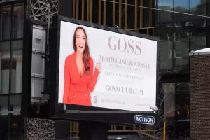 Mais Me Bourassa est aussi une entrepreneure audacieuse. Alors, pour promouvoir son étude auprès du monde des affaires, elle a décidé d’innover en affichant ses couleurs… sur un panneau publicitaire géant en plein centre-ville de Montréal !