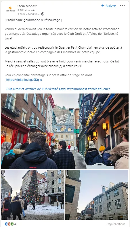 La toute première édition de l’activité Promenade gourmande & réseautage organisée par le cabinet Stein Monast avec le Club Droit et Affaires de l’Université Laval a récemment eu lieu.