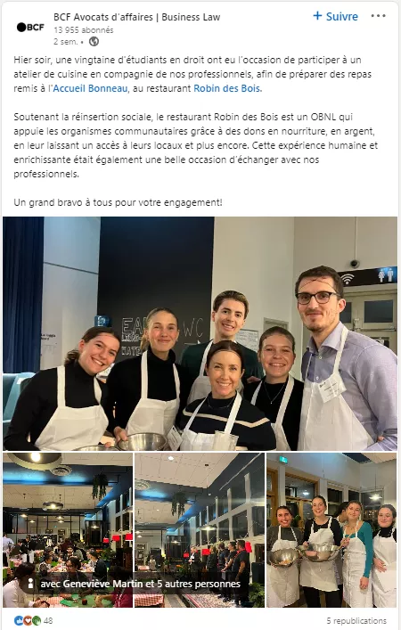 Une vingtaine d'étudiants en droit ont eu l’occasion de participer à un atelier de cuisine en compagnie des professionnels du cabinet BCF, afin de préparer des repas remis à l'Accueil Bonneau, au restaurant Robin des Bois.