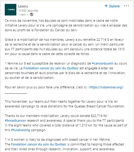 Les équipes de Lavery se sont mobilisées dans le cadre de l’initiative Lavery pour la Vie, une campagne de sensibilisation qui vise à amasser des dons au profit de la Fondation du Cancer du sein.